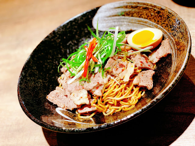 黑牛拌麵的 炙燒香氣,剛上桌就馬上撲鼻而來。滿滿鋪平整個大碗的黑牛嫩煎肉片,還有軟嫩入味的溏心蛋 ,原本以為乾拌麵應該會有非常澀的口感 , 出人意外的是二鬼麵舖的乾拌麵很滑口。
