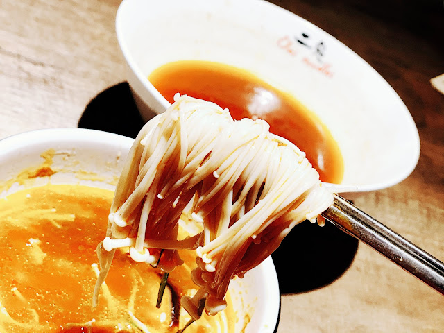 原本想說服自己來點清淡一點的蔬食,所以點了野菇系列,但是沒想到麻辣的湯頭跟菇類竟然這麼意外的和諧,感覺你儂我儂的概念! 因為金針菇不會吸收湯汁,但是會融入湯汁中,撈起一筷子的金針菇,在湯汁還沒有滑下湯碗裡的時候,慢慢品嚐,二鬼麵舖不只麵條很可以,簡單的一盤小菜,都入味的非常讓人驚豔!