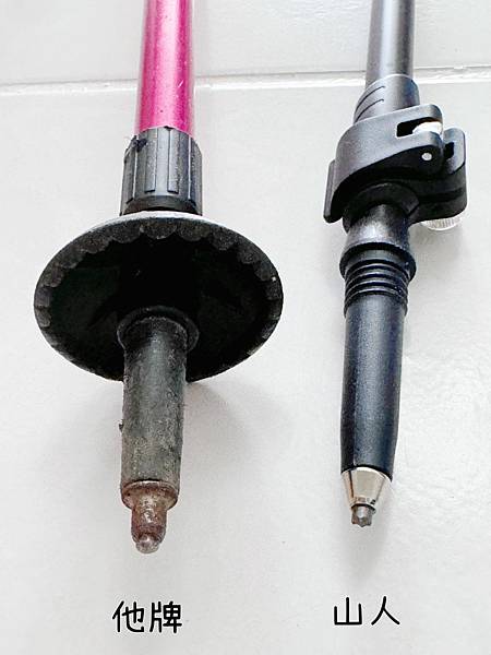 (他牌登山杖,使用一段時間已生鏽,另一山人登山杖,目前仍如新一般使用中)