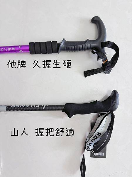 我個人比較喜歡山人登山杖EVA柔軟的材質,相較於他牌的橡膠材質,