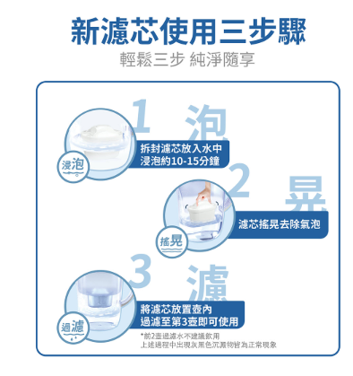 把濾心放置濾水壺內, 過濾到第三壺的水質之後, 就可以開始飲用了。